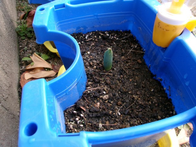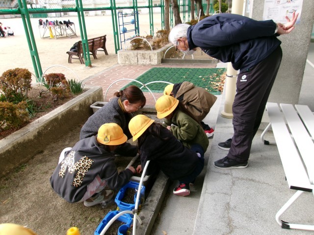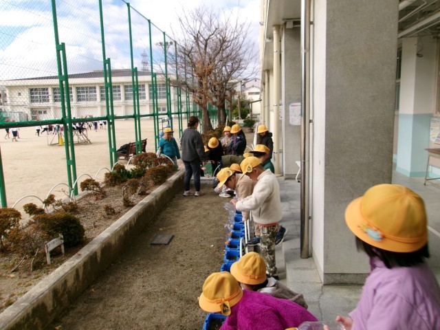 1年生が植えたチューリップ、1月になって芽が出始めました。みんな、うれしそうに水をあげていました。