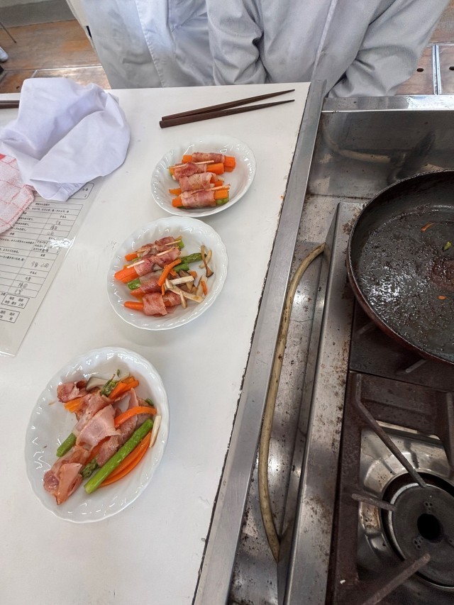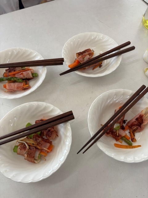 6年生は家庭科室で調理実習を行い、野菜のベーコン巻きを作りました。ベーコンに野菜を巻いて爪楊枝で止めていくのが難しく、すぐにベーコンが破れてしまったり、焼いている間に野菜がばらばらになってしまったりと苦戦しながら、最後はみんな「おいしい!」と試食することができました。