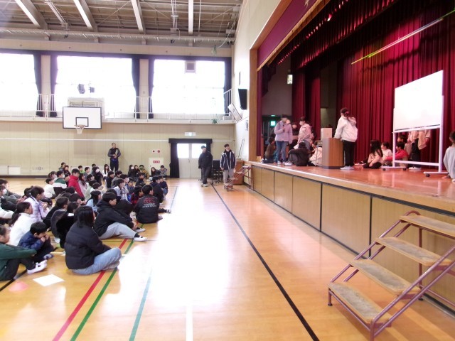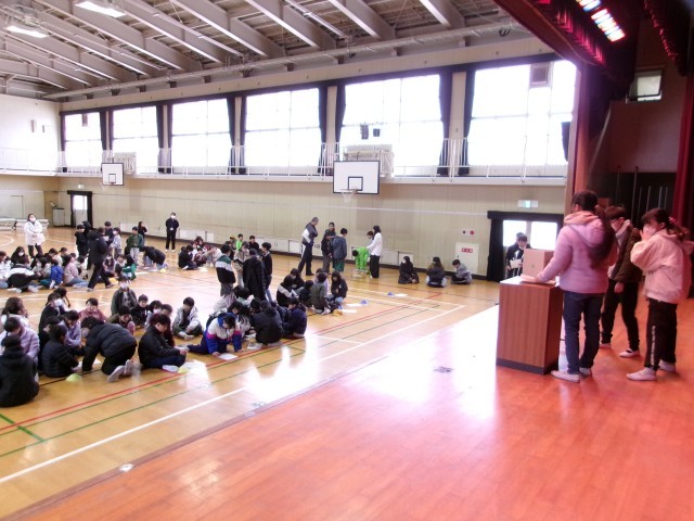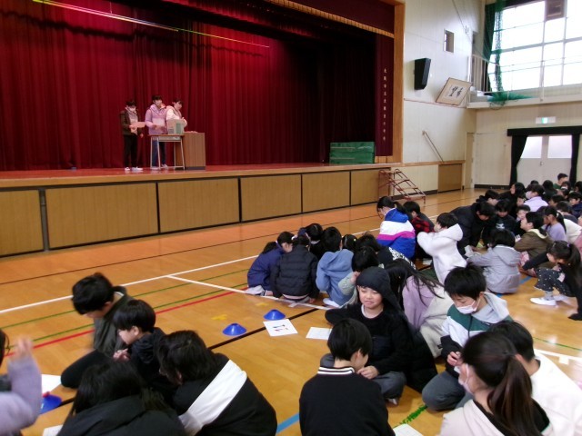 本日の集会ではビンゴ大会を行いました。9つのマスの目にグループごとに好きな数字を書き込みます。集会委員の児童が箱から取り出した番号札と照らして3つ数字が並べばビンゴです。景品はありませんが、みんなで楽しい時間を過ごしました。