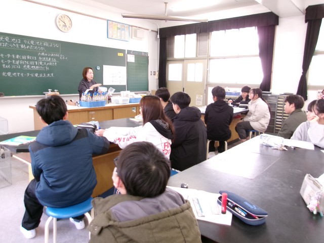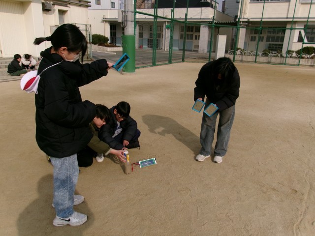 光電池を使っての実験です。電池とつなげた風車の回転の変化を見るために、当たる日光の量を変えたり、プラス・マイナスを逆につなげたりしてみました。