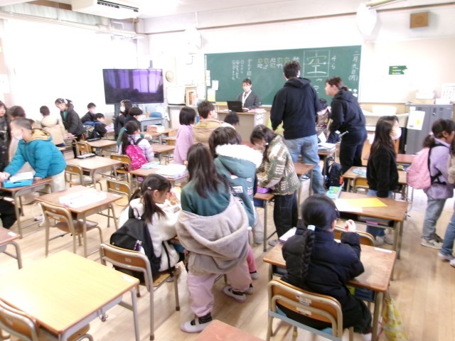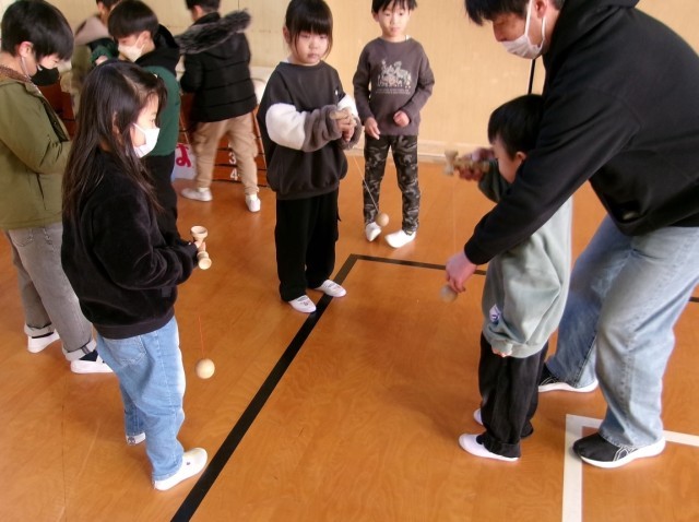 南江口保育所の年長さんが来校し、1年生児童と交流する機会をもちました。けん玉、コマ回し、カルタといった昔遊びをみんなでしました。1年生のお兄さん、お姉さんぶりが頼もしく感じたひとときでした。
