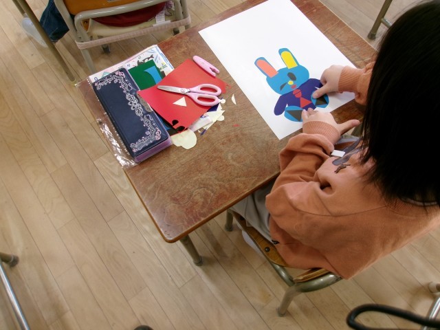「かみはんが」キットを使っての図工です。きれいな色の紙を切り貼りして、思い思いにデザインしています。このあと、これを版画の下地にして、水分をふくませたうえで、白い紙へ写します。できあがりが楽しみです。