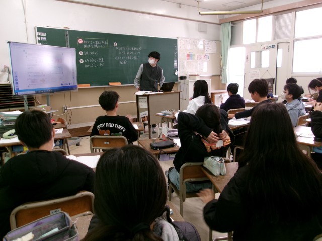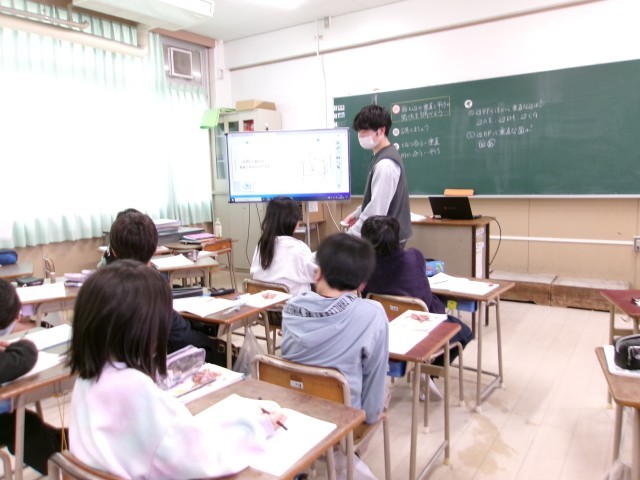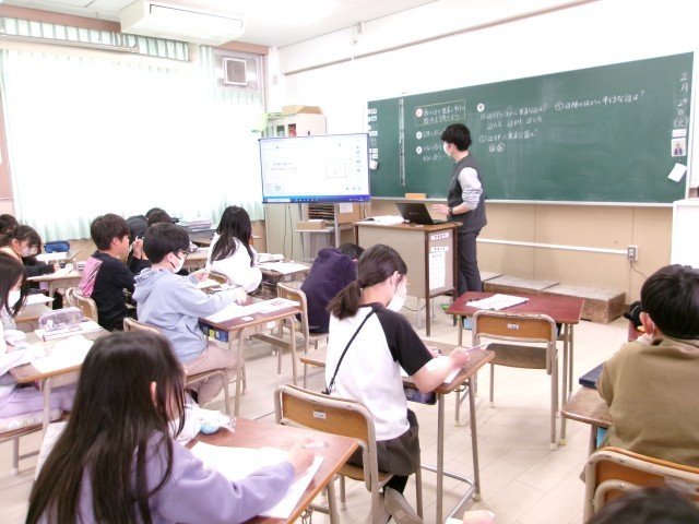 立体図形に関する学習です。指示された辺と垂直な辺はどこか、指示された面と平行な面はどれか、みんなで考えていきました。