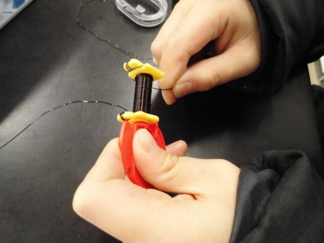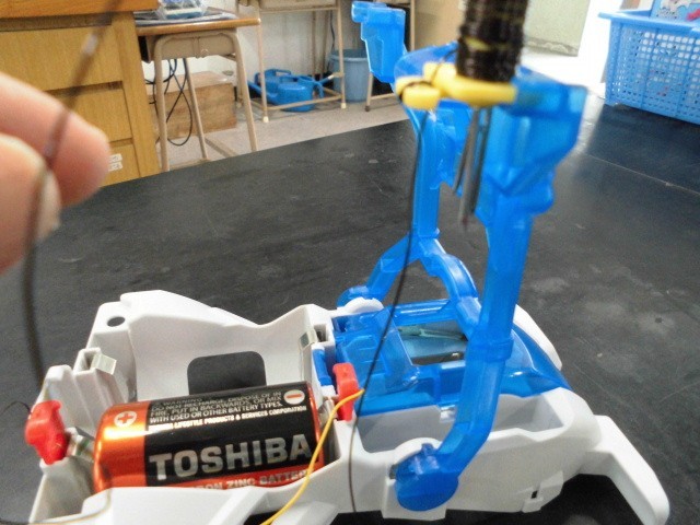 理科の学習で、電磁石をつくりました。導線を50回黄色のパーツにきれいにつめて巻くのが、とても難しそうでした。巻いた後は、釘を1分間で何本電磁石につけられるか、「釘つけ大会」をしました。初めは2、3本でしたが、こつをつかむと、一番多くて8本の釘をつけることができました!でも、もっとたくさん釘をつけたいな。次回は、もっと釘をつけるには、どうすればいいかを考えていきます。