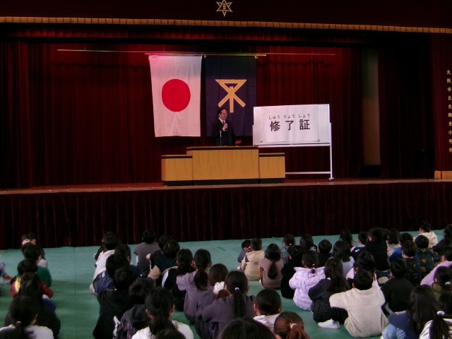 講堂にて令和7年度の修了式を行いました。まず、児童代表の5年生に修了証を授与しました。この修了証は勉強に生活に一年間よく努力したことを証明するものです。みんな本当によくがんばりました。校長講話、生活指導の先生から春休みの過ごし方についての話があった後、今年度をもって大隅東小学校をはなれる教職員を紹介しました。来月、みんな元気で新学年の始業式にのぞんでくれることを楽しみにしています。