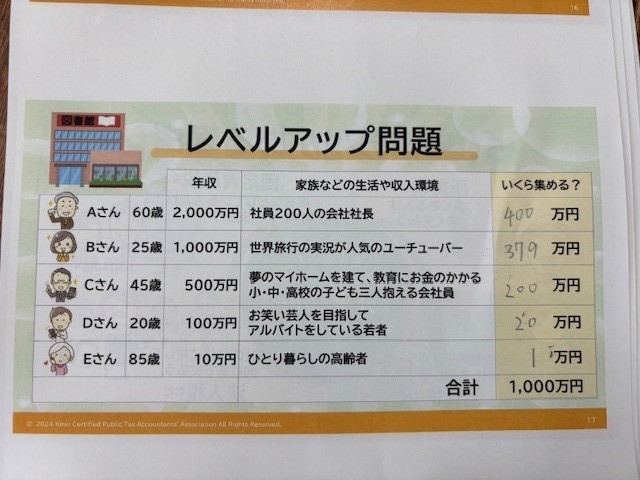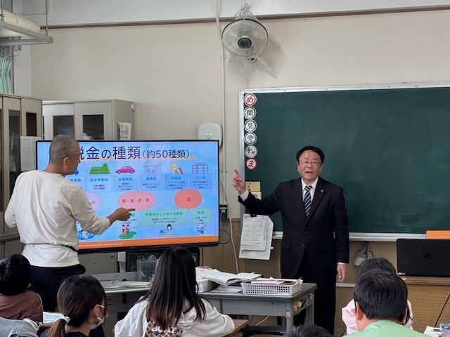 4月27日(月)2・3時間目に租税教室を実施しました。税理士さんを講師に、税金や税金の使い方の学習をしました。また、『図書館を建設するのに1000万円必要です。収入の違うA~Eさんにそれぞれどれだけの税金を払ってもらうのがいいのか。』という問いに対してグループで話し合いをしました。どのグループも収入の多い人からたくさんの税金を払ってもらったほうがいいという話になりました。その人の収入や生活背景などを考えて、公平に税金をいただくという意見がたくさん出ました。みんな一生懸命に考え、取り組むことができました。