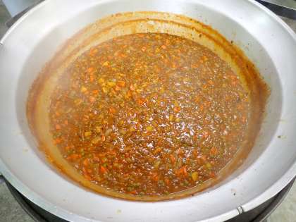 肉だんごとたまねぎ、だいこん、にんじん、むきえだまめ、しめじをチキンブイヨンやカレールウの素、塩で味つけをした煮こみ料理で、子どもたちにも好評です。