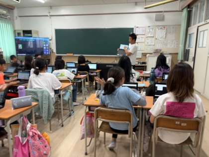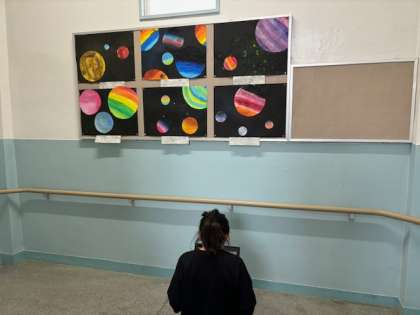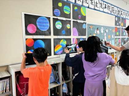 先だって作製し教室や廊下に掲示していた「星」「宇宙」をイメージした図画作品をもとにして、図かんづくりに取り組みました。PCで自分の作品を撮影し、そこに説明記事を自分で考えて書き込んでいきます。どんな図かんがまとまるのか楽しみです。 -