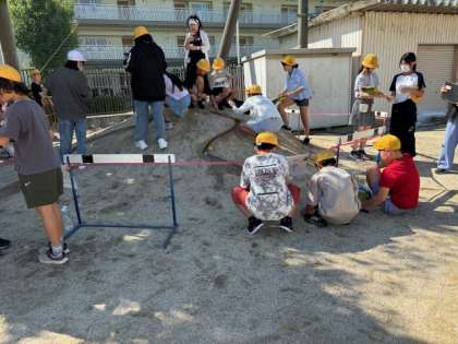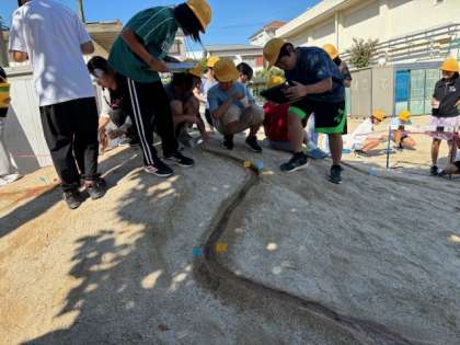 校庭の片隅にある築山で水の流れの様子を確認するための実験をおこないました。川に見立てた溝を山に掘り、そこに色のついた水を流します。上流と下流での流れの違い、カーブをしているところでの水の動きがわかったものと思います。 -