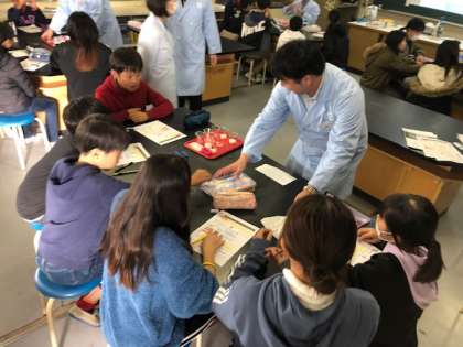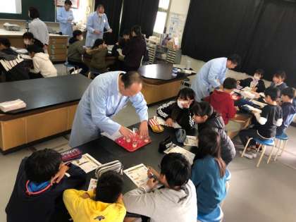 6年生が、飲料メーカーによる乳酸飲料や発酵の現象など身近な食品について、実物を使ってさまざまな働きについて学びました。
