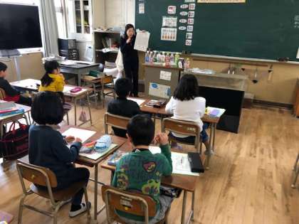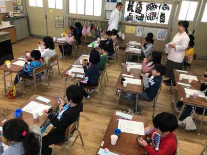 歯科衛生士の先生から正しい歯磨きの仕方を教わりました。はじめに一人一人チェック用の赤い染料を歯に塗って、磨き足りないところを調べました。正しく磨けたか再度チェックすると、どの児童もできるようになっていました。