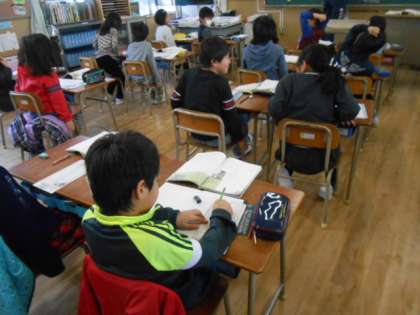2年生が、国語科で物語単元「ニャーゴ」で、登場人物の気持ちを読みとる学習をしています。教科書の文章から登場人物の気持ちを読みとることができる箇所に線を引いて、自分がそのように思った理由をしっかりと発表していました。