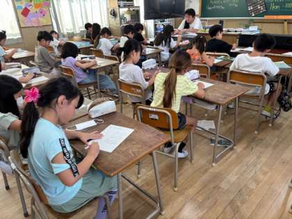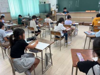 今年度、大隅東小学校では算数科の指導について学校をあげて研究することにしています。その一環として、毎週木曜日の始業前に、「さんすうタイム」と称し、各学級で算数の計算ドリルに取り組んでいます。写真は上が4年生、下が3年生の様子です。 -