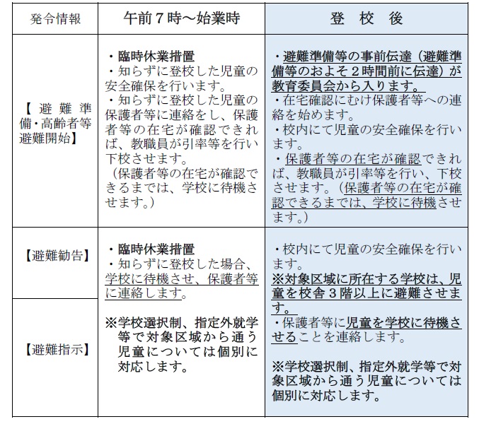 (2)午前7時以降、児童が登校するまでの間に、河川洪水等による「避難準備・高齢者等避難開始」、「避難勧告」、「避難指示(緊急)」のいずれかが東淀川区内に発令されている時