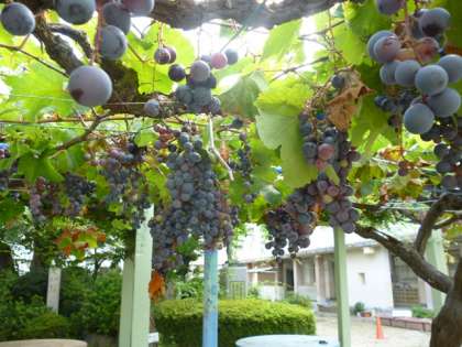 職員室前、中庭のブドウが今年も大きな実をつけ食べごろを迎えてています。