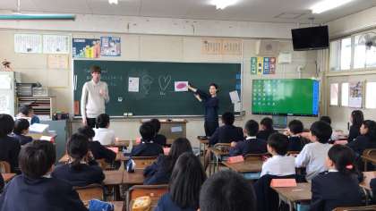 東淀中学校の英語科、笠作先生がC−NETのポール先生とともに英語の授業をします。このような授業は、6年生の各学級に週2時間程度(2時間のうち、1時間は笠作先生とポール先生、もう1時間は笠作先生と担任の先生)行われます。