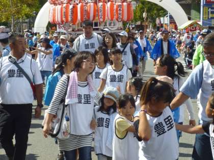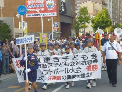 豊里子ども会ソフトボールの偉業をたたえ、地域とは別にパレード順は2番。最前列で行進し沿道から大きな拍手を受けていました。