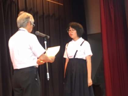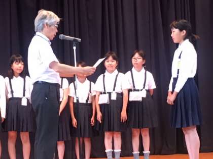 その次は、表彰式です。6年生の久部咲菜絵さんが、『全日本少年少女けん玉道選手権大会』南関西ブロック女子の部で優秀賞の成績をおさめました。また、豊里連合子ども会のみなさんが、『子供会親善地区対抗小学生キックベースボール大会』で、第4位の成績をおさめました。日頃の練習に取り組む姿勢と努力の結果ですね。