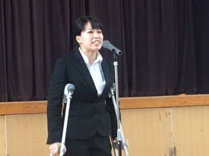 最後に、教育実習生の前嶋佑美先生の紹介です。前嶋先生は、本校の卒業生です。今日から2週間、3年1組を中心に学習してもらいます。