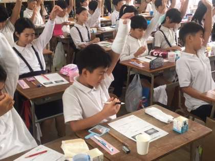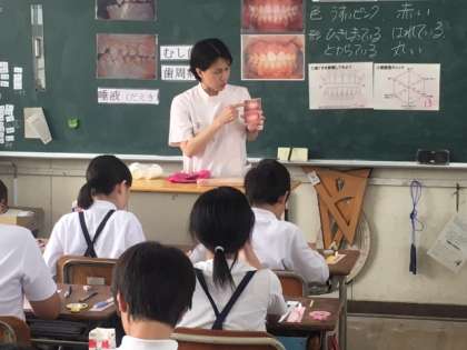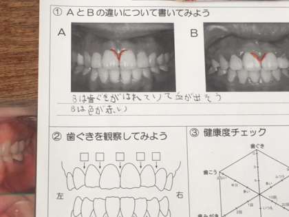 6月11日(火)、歯と口の健康教室を行いました。 歯周病の口の中と健康な口の中を比べ、自分はどうかを手鏡で確かめます。 歯をピンクに染めて、汚れのひどい歯を徹底的に磨きました。 口の中をピンクに染めた結果、みんなピンクのリップを塗ったみたいになっていました。