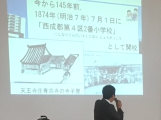 そのあと、教頭先生から「豊里小学校のあゆみ」というスライドを見せてもらいました。豊里小学校の最初の校舎は、お寺だったそうです。