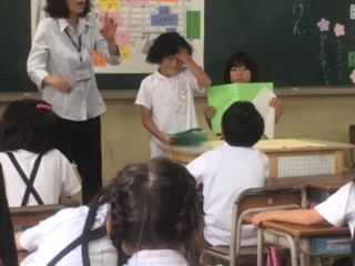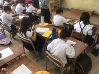 はっぴょうしたあと、おうちのひとに、今日の感想を書いているところをみてもらいました。