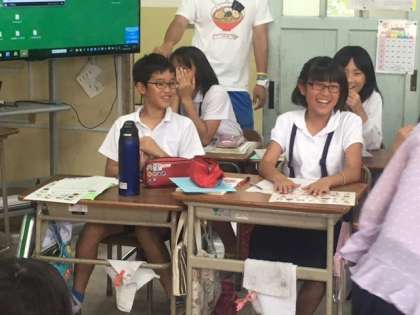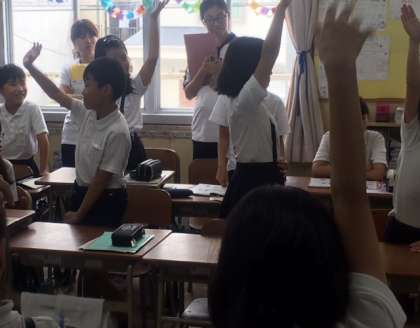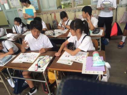 7月3日(水)5時間目、5年3組で英語の研究授業でした。授業者の菊池先生は、ほぼ英語で子どもたちに話していました。菊池先生の話していることと菊池先生のジェスチャーを見ながら、子どもたちはなんとなく理解しているようでした。アルファベットビンゴも、目で見て話を聞いて、次にすることを理解していました。見ている大人よりも実際に授業に参加している児童のほうが理解がはやいです。授業中は、みんなノリがよく、発表するときも、「イエス、イエス」といいながら手をあげていました。みんな笑顔で、本当に楽しく英語の学習をしていました。