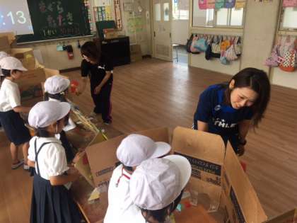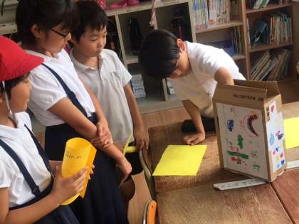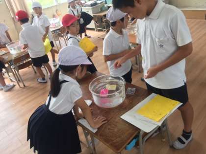 水の入っている水槽にコインを落とし、おはじきの箱やペットボトルのふたに入れるゲームです。なかなか入らず苦労していました。