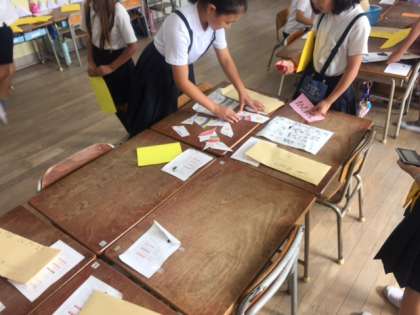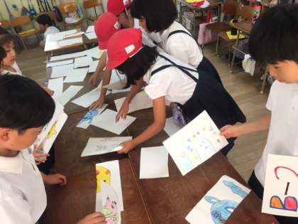 絵を描いた画用紙を半分に切って、裏向けにしています。トランプの神経衰弱のようにそろえていきます。いっぱいあるものから絵をそろえていくのは、難しいようです。