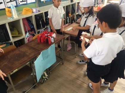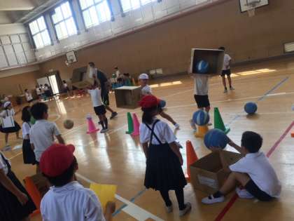 児童が持っているダンボールに、ボールを入れる遊びです。ダンボールが時々動くのでとても難しいです。みんな汗をかきながら、元気にお店番をしていました。