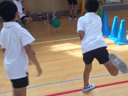 ペットボトルをボーリングのピンに見立てて、ボールでねらって倒します。倒したピンの数を競い合います。ふだん休み時間にドッジボールをしている6年生は、とっても上手に倒していました。