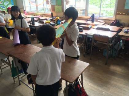聞こえてくる曲の題名を伝えるゲームです。曲がかかると、みんな一斉に伝えていました。低学年の子は、知らない曲もあり少し難しかったかもしれません。でも、低学年の児童も、その場の楽しい雰囲気を感じていました。