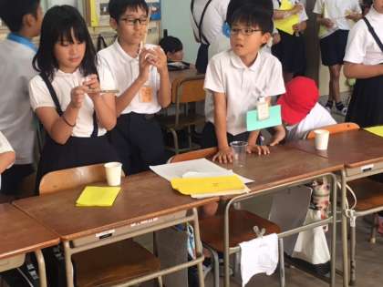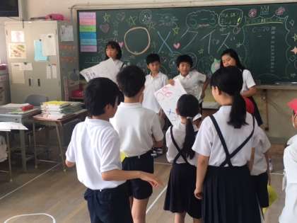 問題にたいして、〇か×かで答えるいたってシンプルなゲームです。縦割り班みんなで考えて〇か×か選びます。シンプルですが、正解したときは、歓声があがるくらい盛り上がります。