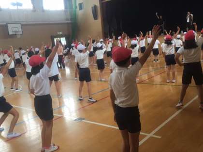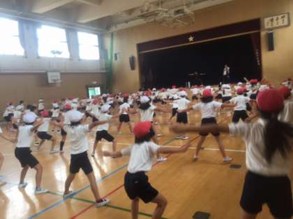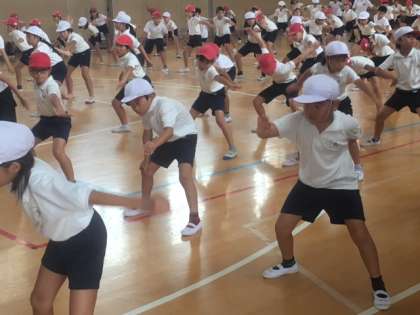 8月28日(水)4時間目、4年生が運動会の練習をしていました。事前にDVDで、踊りの学習をした後、講堂で練習をしていました。腰をしっかり落としたり、速い動きがあったりして少しハードですが、みんな一生懸命にがんばっていました。