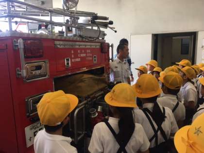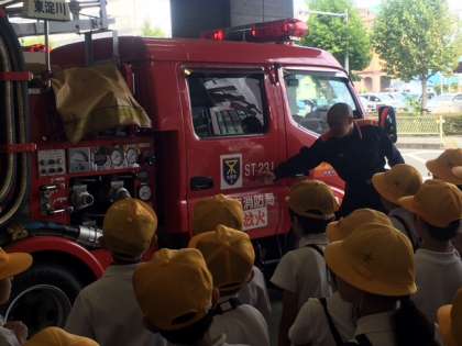 9月12日(木)、4年生が消防署へ社会見学に行きました。消防署では、火事に関するDVDを見ました。その後、消防署の人にわからないことや不思議に思ったことを質問しました。また、消防車やポンプ車、はしご車の見学をしたり、消防隊員さんが訓練しているところを見たりしました。