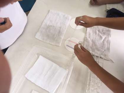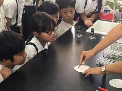 みんな慎重にガラス棒を使って、水溶液をリトマス紙につけていました。さすが6年生。実験中はみんな立って、危険のないように集中して実験していました。