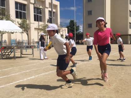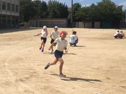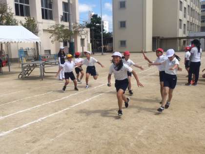 2時間目、運動場から子ども達の歓声が聞こえます。リレーをしていて、自分たちのチームを応援している声です。バトンの受け渡しはとても迫力がありました。