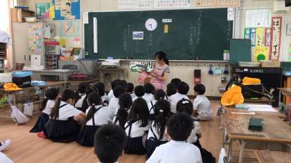 9月18日(水)、水曜日は読書タイムです。今日は1年生に絵本ばたけさんからの読み聞かせをしてもらいました。