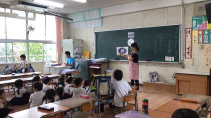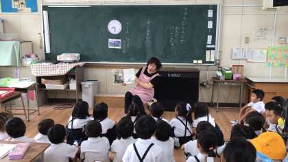 一年生向けに楽しい絵本を選んでいただいています。「かくしたのだあれ」は、子どもたちが挿し絵の中から誰かを見つけ出す、一緒に楽しめるお話でした。「月からきたうさぎ」は、挿し絵の美しい、長いお話でしたが、子どもたちは絵本の世界に入り込んで、最後までしっかり聞いていました。絵本ばたけのみなさん、いつもありがとうございます。(校長)
