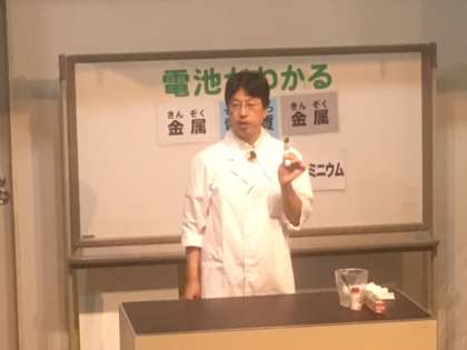 サイエンスショーでは、電池のしくみについての実験でした。電池のしくみにとても興味津々でした。電池は、電解質を2種類の金属で挟み込めば簡単にできるという実験をしました。右手にスプーン(金属)、自分(電解質)、左手にアルミホイル(金属)そこへスプーンとアルミホイルの間に電球をいれると電気がつくことに驚いていました。