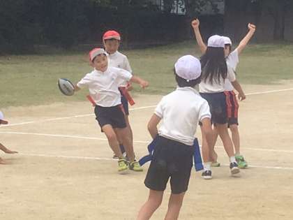 安全面を考え、タグラグビーでは、タックルのかわりに腰につけてあるタグを取ります。タグを取られた子は、必ず後ろにパスを出さなければいけません。そうして、チームが協力してゴールラインにボールを運びます。