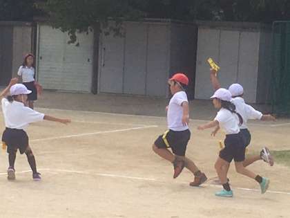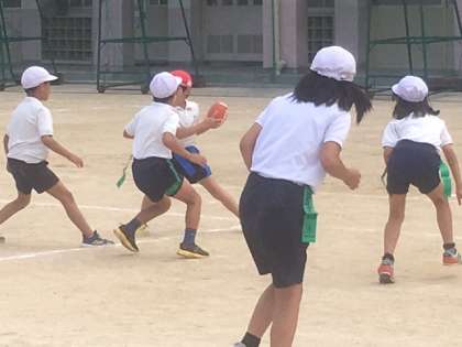 10月15日(火)、今日は、先週に比べて少し肌寒いような気がします。そんな中、運動場では、元気な子どもたちの声が聞こえてきます。3年生が、タグラグビーをしていました。
