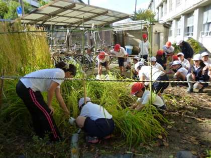 5年生が、初夏に植えた稲がたわわに実り、収穫の時期となりました。