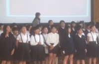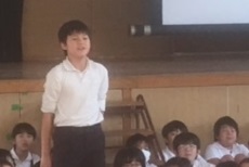 3時間目、講堂で5年生が学習発表会の練習をしていました。児童が英語で会話をしたり、英語の歌を歌ったりしていました。時々、発音に関する指導がはいり、上手になっていきます。