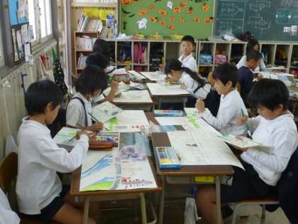 いよいよ下絵に、水彩絵の具で着色を始めました。