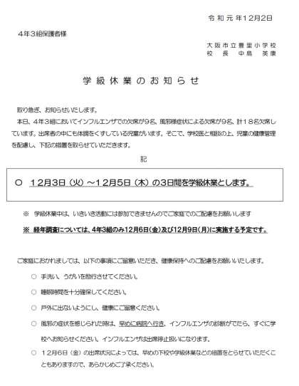 取り急ぎ、お知らせいたします。4年3組では、インフルエンザでの欠席が9名、風邪様疾患での欠席が9名、計18名欠席しております。出席者の中にも体調を崩している児童がいます。そこで、学校医と相談のうえ、児童の健康管理を配慮し、12月3日(火)〜12月5日(木)の3日間学級休業します。お子様、ご家庭の健康管理にご留意ください。