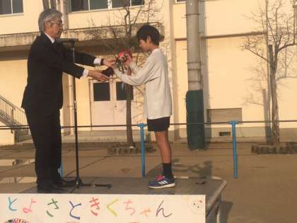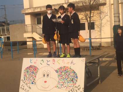 児童会からは、先週行われた「みんなで豊里っ子宣言」の取り組みの振り返りの話がありました。朝礼台の前には、完成した「とよさときくちゃん」も飾ってありました。