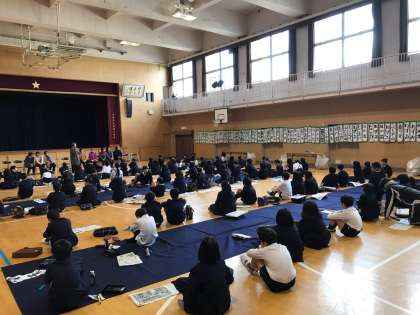 毛氈(もうせん)の上で筆をはしらせることも、縦長の半紙を使うのも初めての子どもたちがほとんどでしたが、先生方のアドバイスのお陰で文字のバランスなどに気を付けながら集中して取り組むことができました。子どもたちは、出来上がった作品を見て、満足そうな表情をしていました。