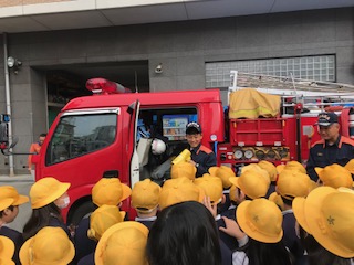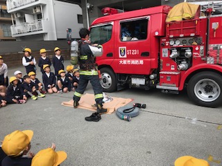 大阪市の消防について学ぶグループと、消防士の方から直接話を聞いたり、消防車の設備を見せてもらったりするグループに分かれて見学しました。