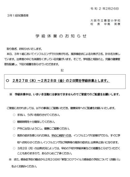 取り急ぎ、お知らせいたします。3年1組では、インフルエンザでの欠席が6名、風邪様疾患での欠席が2名、計8名欠席しております。出席者の中にも体調を崩している児童がいます。そこで、学校医と相談のうえ、児童の健康管理を配慮し、2月27日(木)〜2月28日(金)の2日間学級休業します。お子様、ご家庭の健康管理にご留意ください。